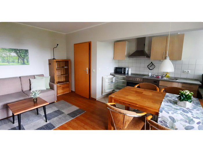 Wohnzimmer mit offener Küchenzeile und großzügigem Essplatz
